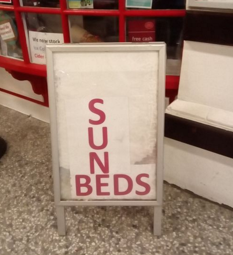But the thing is… I keep trying to write, and the words aren’t popping out like they were a month or so ago. Back then, I couldn’t stop the words from flowing, and when they flowed, they were goooood. Satisfying friendly sentences were writing themselves and I felt like my job was to act as their servant – I was totally attuned to the meaning behind the words, and all of the ideas were simply flashing out of my fingers and into the computer, at a speed I could hardly keep up with. And I liked it. But that’s not happening at the moment, which is a tad annoying. In all honesty, lately I’ve felt like all my best efforts involve dragging words out one by one and arranging them in a way that ultimately equates to a shitty sign that says ‘SUNE BEDS’, much like the one in the picture on this post. Pffffffffff.