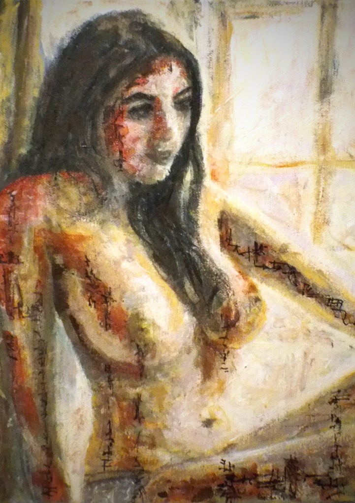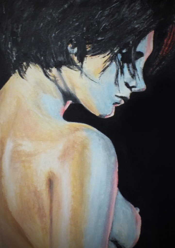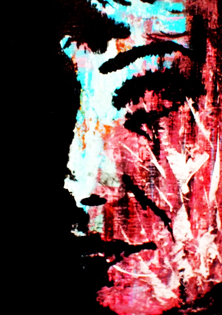 At the end of 2017, while my narcissistic ex stalked me and I tried (successfully, it would seem) to avoid thoughts of suicide, I discovered that I could paint. I was immobilised at the time by a horrible depression and a hellish dental pain, and I wasn’t enjoying living by myself in my little flat in Ramsgate, so one day, out of desperation more than anything else, I thought, ‘Fuck it, I’m going to buy some paint, a couple of brushes, and a canvas,’ and I gave it a whirl. A couple of days later I’d finished my first painting: a self portrait. I had long hair then.