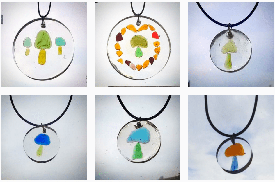 I went to this beach a lot during the lockdowns of 2020, and I ended up with bags and bags of these little coloured pieces of glass, and once I was back at home I used the free time that Covid granted me to learn how to use epoxy resin – a pourable liquid solution that sets into a hard transparent type of plastic. Thus was born a new industry: making glass mushrooms and setting them in little pendants. I made about 25 of these, thinking that I would sell them, but then I forgot to tell anyone about them, and I started writing a book instead. So now I have loads of pendants for sale, which look like this: